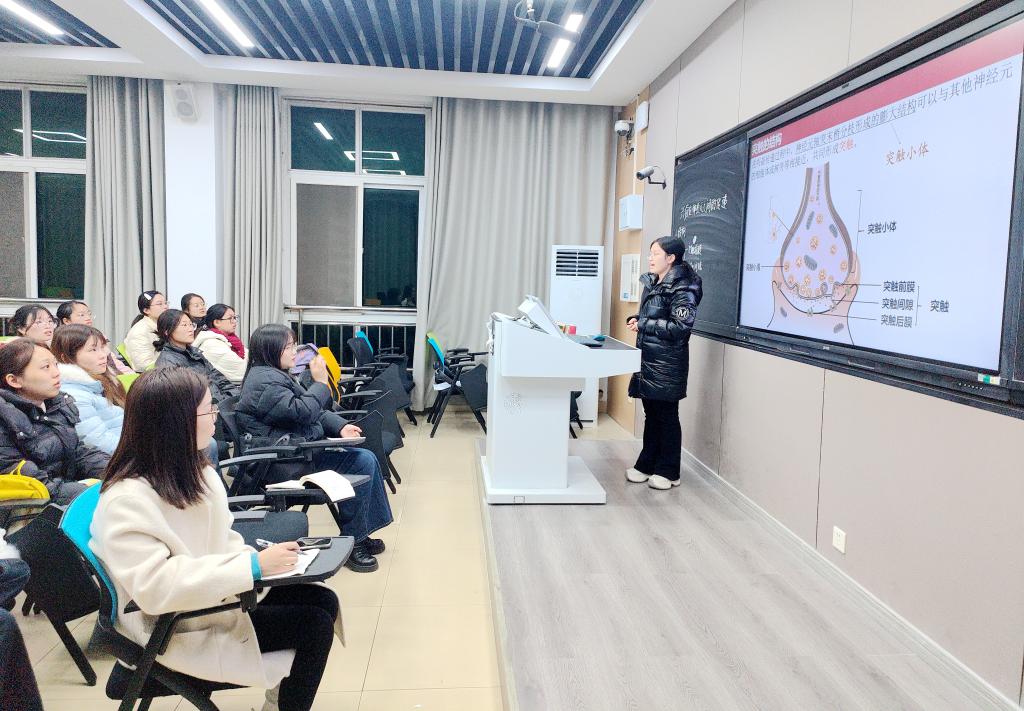 比赛中,每位“讲师”都聚焦生物科学核心展开教学,如刘倩同学以《兴奋在神经元中的传递》为内容,一边在电子黑板勾勒突触间兴奋传递的路径,一边结合动态示意图拆解电信号与化学信号的转化过程,让抽象生理机制变得直观易懂;刘颖同学以“分隔、物质运输、信息交流”为框架,将《细胞膜的功能》的知识点梳理得逻辑分明,让学员们快速抓住核心重点;张彬同学讲解《酶的特性》,清晰梳理高效性、专一性等核心要点,课堂节奏紧凑又清晰。微型课比赛结束后,评委从教学目标、教学内容等方面对参赛师范生的授课进行了点评。经过激烈的角逐,最终刘倩、胡舒心等3位选手获得一等奖,张彬、丁梦真等5位选手获得二等奖。