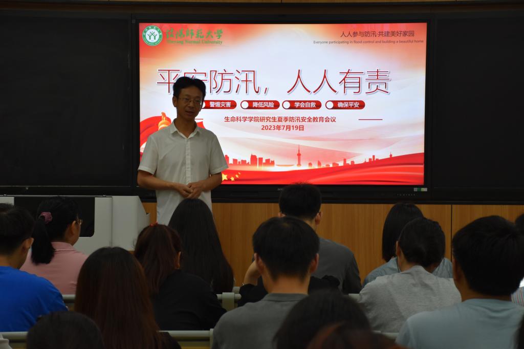 夏季时有强降雨天气出现,汛期也接踵而至,彭波首先通过郑州特大暴雨具体案例,认真分析其存在问题,生动阐述洪灾发生的特点、危害性以及防汛减灾的重要意义,利用大量真实的图片、生动鲜活的案例阐述洪灾的危害性和防汛安全的重要性,并分享了防汛抢险救灾的做法。其次,通过观看防汛安全教育讲座,并结合我省汛期特点,对同学们学习汛期安全的基本知识,培养有关安全防范力进行相关教育指导。最后,为了防范和遏制安全事故发生,结合防汛演练从实处落实,对实验室、自习室、宿舍进行安全隐患排查,让同学们有效掌握防汛救灾知识,增强防汛应急能力。