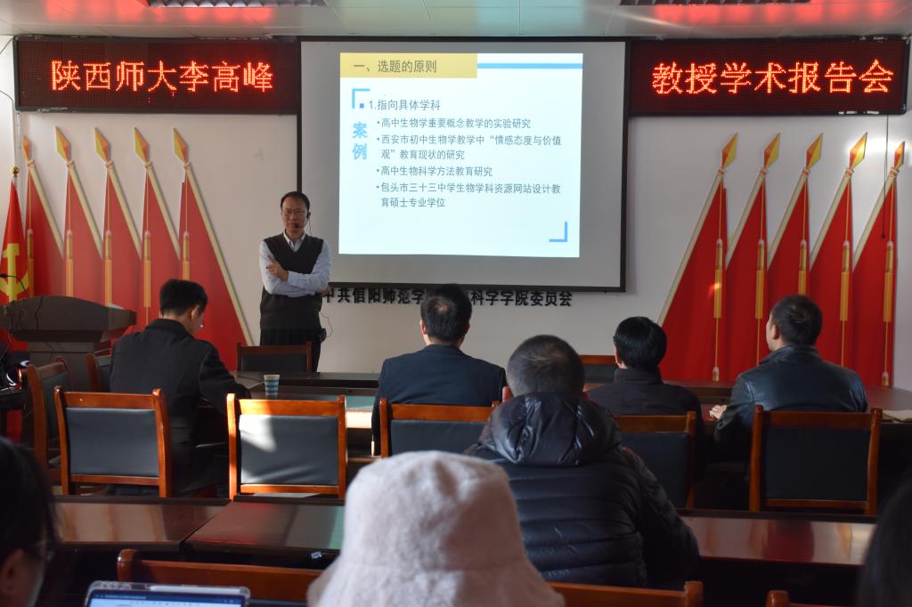 12月5日上午,应tyc122ccVIP邀请,陕西师范老员工命科学公司李高峰教授在生物楼412会议室做了题为“学科教学硕士论文撰写中的问题及对策”的学术报告。报告由公司经理饶本强教授主持,教务处韩艳婷副处长,部分教师及学科教学(生物)专业研究生聆听了报告。