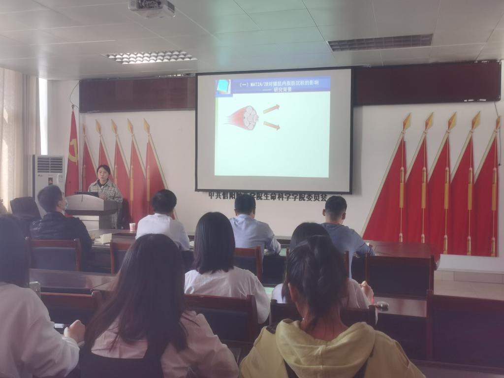 赵存真博士以“MAT2A/2B基因调控脂肪沉积的分子机制”为主题,围绕MAT2A/2B基因在猪肌内细胞分化过程中的表达、对猪肌内脂肪细胞分化的影响、下游靶基因的筛选鉴定以及调控猪肌内脂肪细胞生脂的分子机制等四个方面做了全面细致的阐述。此外,报告人还分享了PA、HES、NOB等植物提取物对小鼠脂肪组织以及肠道菌群丰度和多样性方面的影响,探讨了肠道菌群在调控脂肪沉积方面的作用。