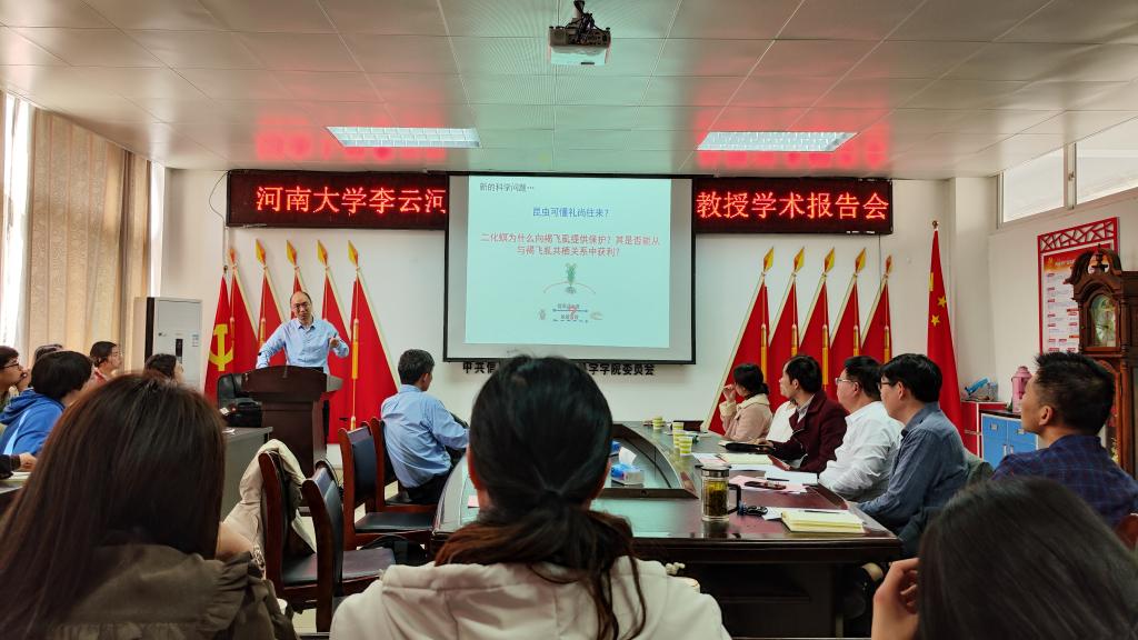 2023年3月9日上午,应tyc122ccVIP邀请,河南大学周树堂教授和李云河教授在生物楼412会议室,分别做了题为“昆虫高生殖力的遗传基础与分子调控机制解析”和“二化螟与褐飞虱协作应对水稻抗虫防御的生态和分子机制”的学术报告,公司青年教师及部分员工聆听了报告。报告会由经理饶本强教授主持。
