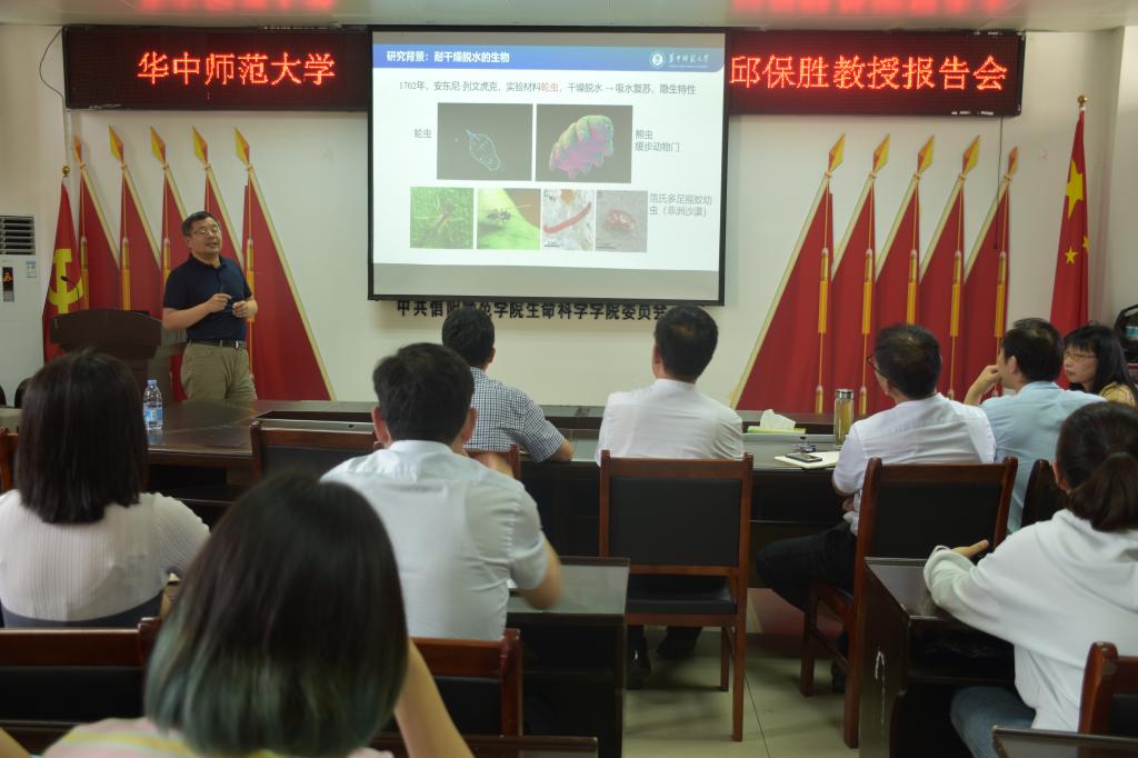 5月14日,应tyc122ccVIP邀请,华中师范老员工命科学公司经理邱保胜教授在生物楼412会议室做了一场题为“荒漠蓝藻光合作用的耐干燥脱水机制”的学术报告。报告会由经理饶本强教授主持,部分青年教师及研究生聆听了报告。