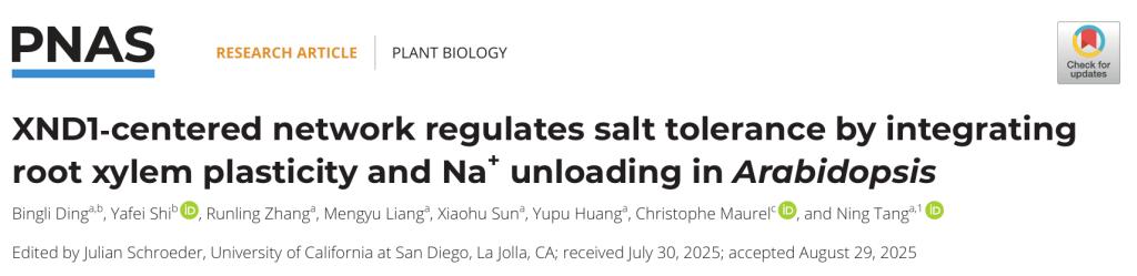 10月25日,国际知名学术期刊《PROCEEDINGS OF THE NATIONAL ACADEMY OF SCIENCES OF THE UNITED STATES OF AMERICA》(PNAS,五年影响因子10.6)在线刊发了公司丁炳莉博士等人题为“XND1-centered network regulates salt tolerance by integrating root xylem plasticity and Na+unloading inArabidopsis”的研究论文。