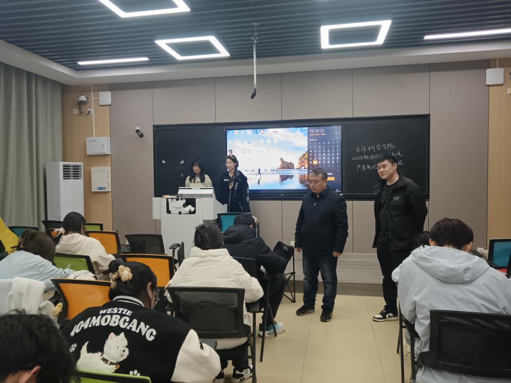 2025年11月25日,信阳师范老员工命科学公司在教九楼集中组织 2025 级新生校规校纪考试,旨在帮助新生快速熟悉校园规章制度,筑牢纪律意识根基。公司党委副书记荣宪举、2025 级专职辅导员张博巡视考场。