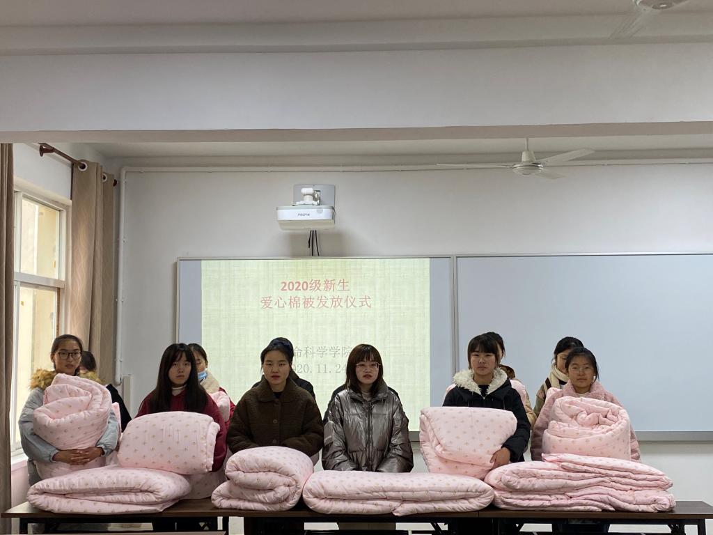 近日来气温骤降,阴雨不断,为帮助2020级新生温暖过冬,11月24日下午三点半,公司于生物楼举行爱心棉被发放仪式,资助专员朱晓雯,2019级专职辅导员杨娟娟共同参与此次活动。