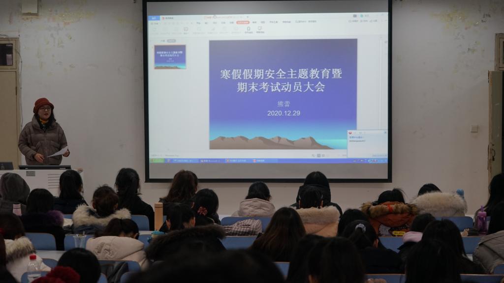 会上,孙太红和熊蕾以及李敏就期末考试和假期安全两方面向参会学子作出详细的讲解。孙太红强调2017级学子作为应届毕业生需要做好应届毕业年的相关工作,提前为即将到来的毕业季做好时间安排。他指出在期末考试期间要做好疫情防护不能掉以轻心,同时又重申了期末考试相关的考试规则和纪律。熊蕾嘱咐到场学子如实完成假期活动去向表的填写工作,并从财产安全、交通安全、消防安全等方面提醒全体学子要注意假期安全。她讲到疫情反复,建议减少外出。李敏针对期末考试安排、考试纪律及寒假安全提示做了详细说明,她要求学子们以端正的态度对待期末考试,认真复习,并预祝全体学子在考试中取得优异成绩。