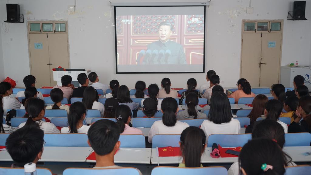 大会直播在《义勇军进行曲》的雄壮旋律中拉开序幕。学子们热情高涨,挥动手中红旗,为祖国庆生。直播中,各个阅兵方队气势磅礴,精良的装备和高昂的士气充分展现我国国力之强。涵盖着各行各业、各族各界的游行活动展现了时代特色和区域发展特点,体现出中华民族从站起来、富起来到强起来的伟大飞跃,热烈的掌声和如潮的欢呼声响彻全场,把群众游行推向高潮。军乐团奏完阅兵曲最后一个音符,历时1个多小时的阅兵落下帷幕。