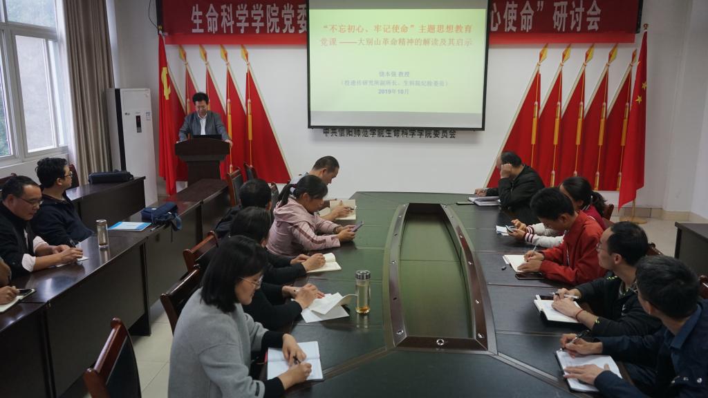 会上,饶本强首先介绍了生科院“不忘初心、牢记使命”主题教育的相关安排,强调此次党课专题学习的出发点是“沿着习总书记考察鄂豫皖大别山的足迹,探寻大别山精神之源”。在党课中,饶本强以2019年9月16-18日习近平总书记在河南考察鄂豫皖革命根据地为背景,以“大别山革命精神的解读及其启示”为主题,从大别山革命根据地辉煌的革命历史回顾、大别山革命根据地对中国革命的历史贡献和继承大别山革命传统和精神的启示三个方面深入解读了探究大别山28年红旗不倒的原因和大别山精神的内涵和重要历史地位。最后,饶本强指出,“信仰坚定、团结奋进、朴素务实、担当奉献”的大别山精神是我党的宝贵精神财富,希望通过这次党课,支部各位党员要积极传承红色基因,进一步坚定中国特色社会主义和共产主义的理想信念,从大别山精神中获得精神上、思想上的洗礼,增强党性修养,把“不忘初心,牢记使命”与本职工作有机结合起来,为实现中华民族伟大复兴的中国梦而奋勇前进。
