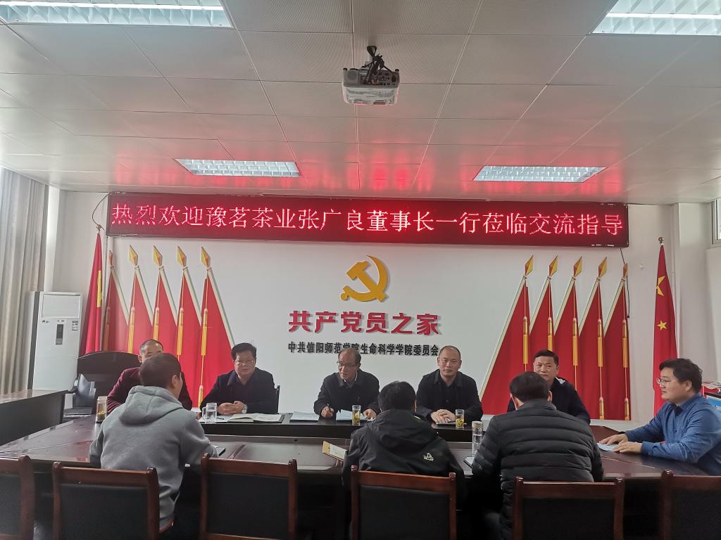 11月15日上午,信阳豫茗茶业有限公司董事长张广良、副总经理陈保明到tyc122ccVIP,开展产学研合作交流。tyc122ccVIP(茶学与食品科技公司)经理饶本强、副经理周棋赢,河南省茶树生物学重点实验室主任江昌俊以及部分专业教师参加了交流会。经理饶本强主持会议。